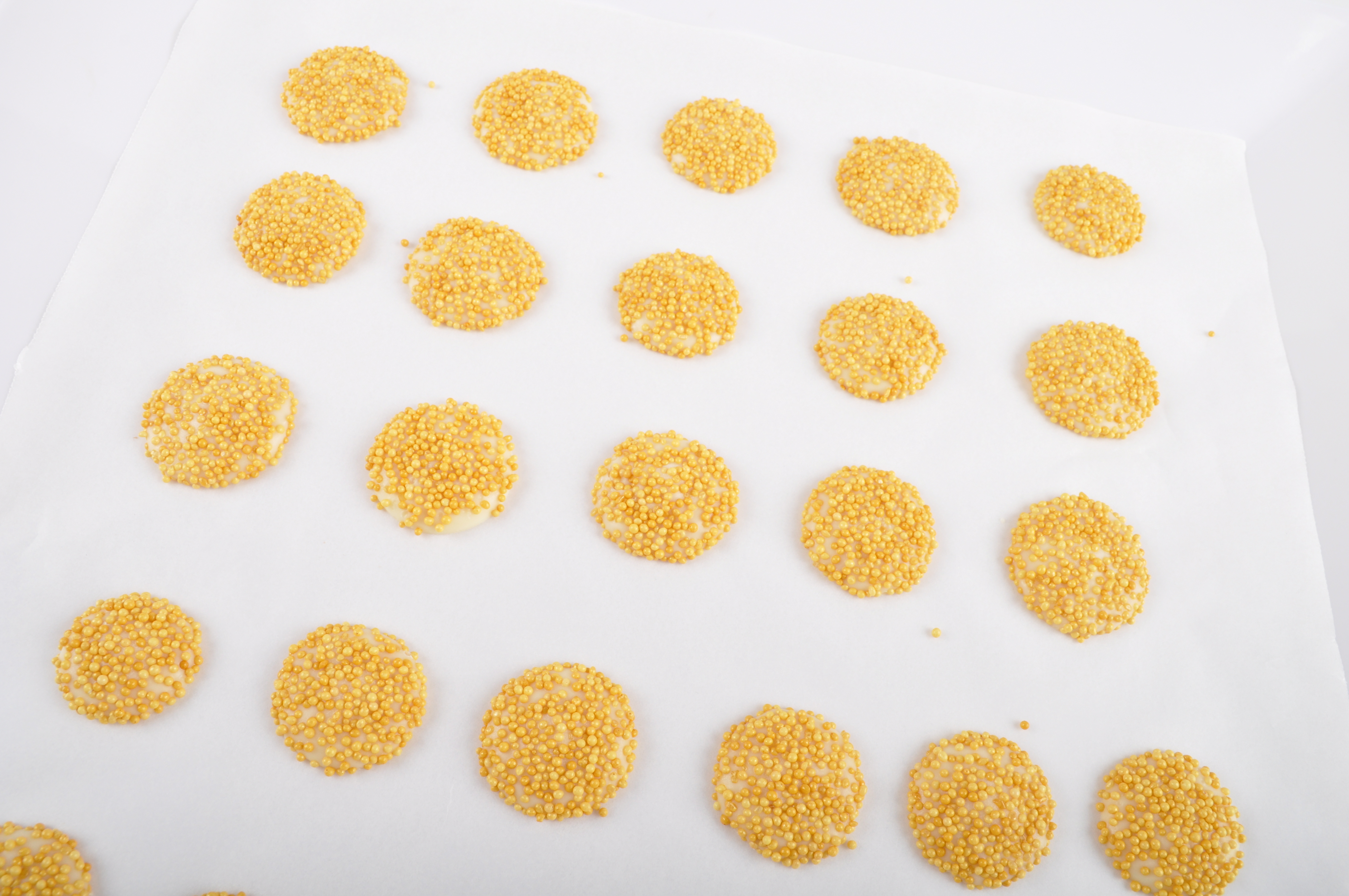 Another method, is to cover the tray with the sprinkles and then pipe directly onto the sprinkles. This methods is useful when you aren't as fussed about creating even shapes, and you dont mind if the top and bottom of each freckle is flat.